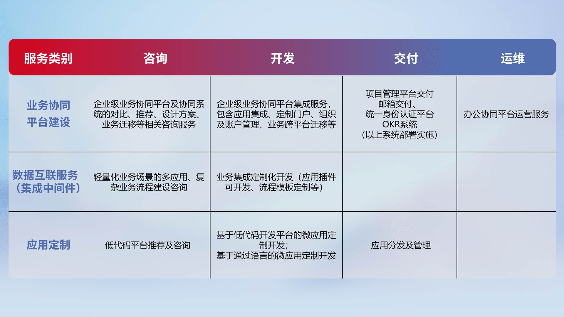 针对钉钉、、、、企微、、IDaas等平台级产品提供产品的规划、、方案、、、交付、、、定制化开发等服务,,实现如统一协同办公、、、、智能客户服务、、混合会议管理、、、、智能数据查询、、、等业务场景,,实现数字化转型。。。