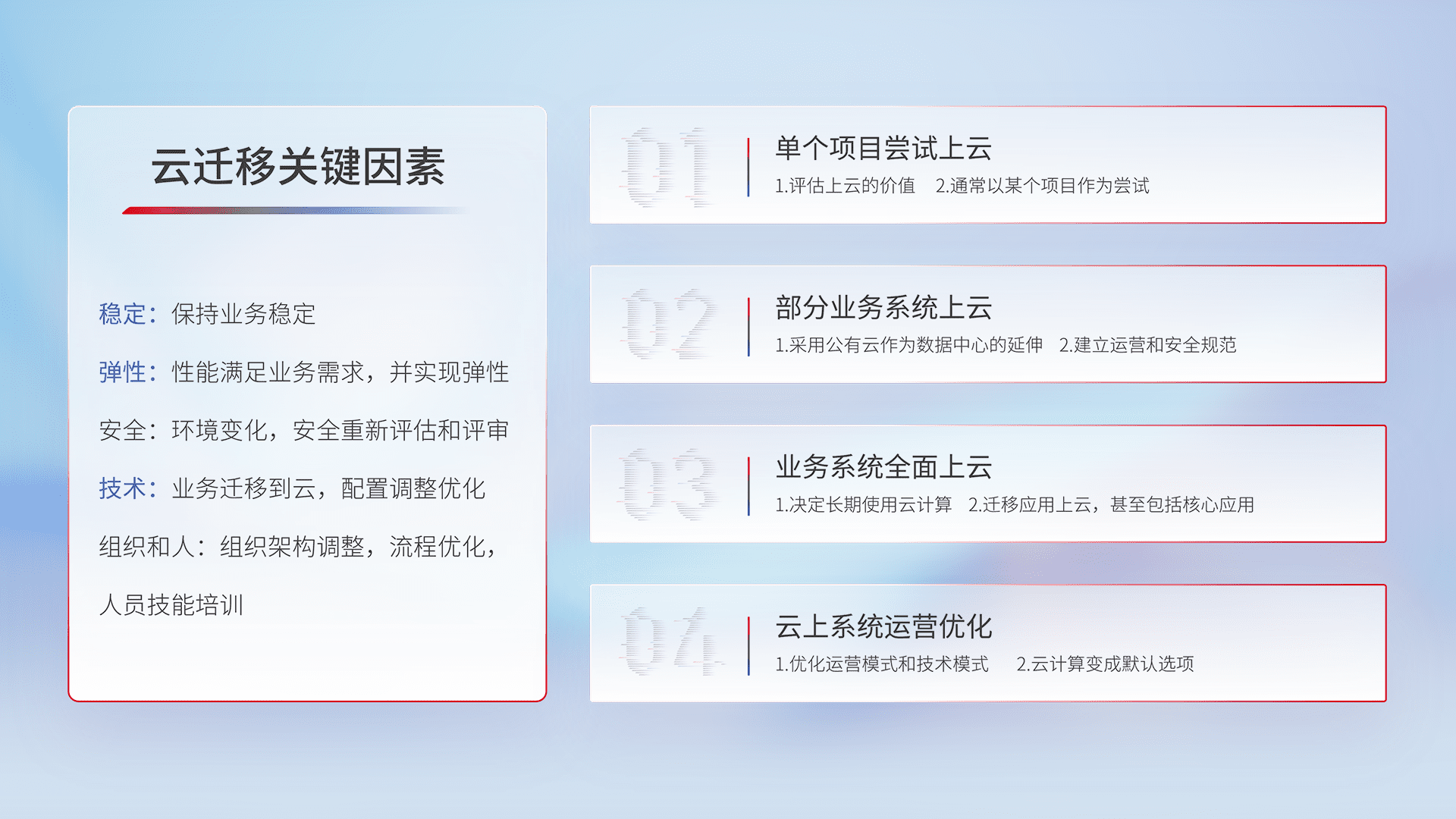 结合实际业务,,,,从规划设计、、、云平台选型、、云原生改造、、、、数据迁移、、、集成交付,,,迁移全过程为客户识别最佳上云路径,,,,做好风险识别管理,,,设计网络架构、、、、身份权限、、、、安全审计合规、、、操作审计、、、日志审计、、、监控告警策略、、、多站点容灾设计等,,,对云上基础设施进行整体规划,,提升IT治理水平,,,以满足弹性、、、、高可用、、、、高性能的需求。。